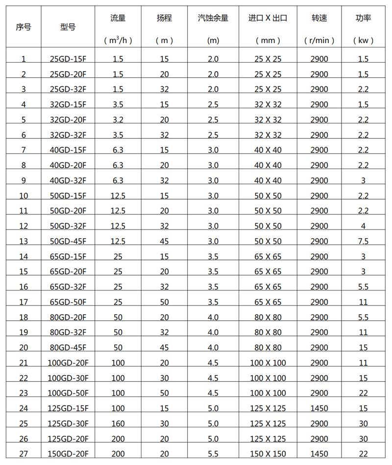 GD-F系列氟塑料合金管道泵是單級單吸立式結(jié)構離心泵,進出口相同并在同一直線上。GDF系列過流部件緊襯氟塑料。該泵采用的外裝式四氟波紋管機械密封,對于輸送含雜質(zhì)顆粒介質(zhì)時,可配用無冷卻水單端面硬對硬(碳化硅對碳化硅)機械密封,所以用戶選型時需考慮到介質(zhì)中的固體含量。
